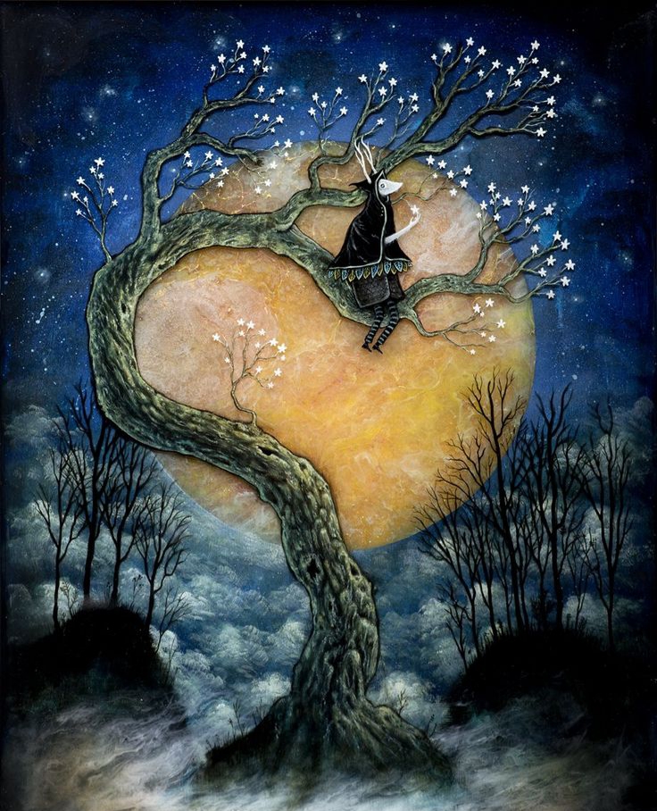 Картина меня тронула неимоверно. Среди всех сказочных работ этого художника она самая трогательная. Эта лунная козочка такая худенькая и печальная. Хотя козочка ли? Непонятно. Кракозябра какая-то. Я всё гадала: чего она так высоко забралась на дерево. Но это непонятное, несуразное существо почему-то вызывало у меня неизъяснимую нежность. И тогда я взяла и придумала ей имя. Оно получилось шутливым. Свободные ассоциации привели к стихотворению. Я и забыла было про него, но недавно прочла у Игоря Муханова про лунную козу и вспомнила свою. Большое спасибо за Ваше доброе внимание!