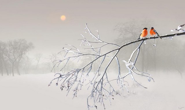 От снегирей на ветках белых,